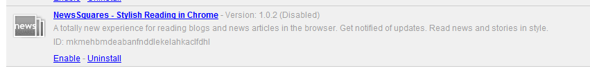 If you have tried to disable notifications via NewsSquares' notification window - it won't work properly (sorry Chrome bug! haha). Please go to our options page to disable notifications instead. If in some cases NewsSquares get disabled instead, please go to "chrome://extensions" then find "NewsSquares" and click "Enable". It should be back on the new tab page. It's kind of funny, we know, but please forgive Google - Chrome's App functionality is new!